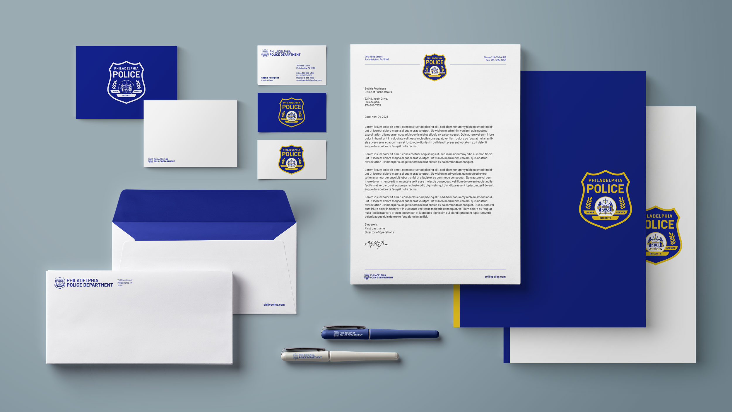 We carefully re-interpreted all of the symbols and imagery in the many-varied versions of the existing logo emblem — reducing from too many (sometimes up to 13) colors down to a two-color (and single-color) sharply refined illustrated composition. Our premier goal was to preserve the essence of their recognizable badge, while infusing it with contemporary utility and timeless style. This visually clarified emblem, along with an updated typography system, gives the department full ownership over their identity — establishing brand consistency with a highly legible and easily reproducible logo mark.